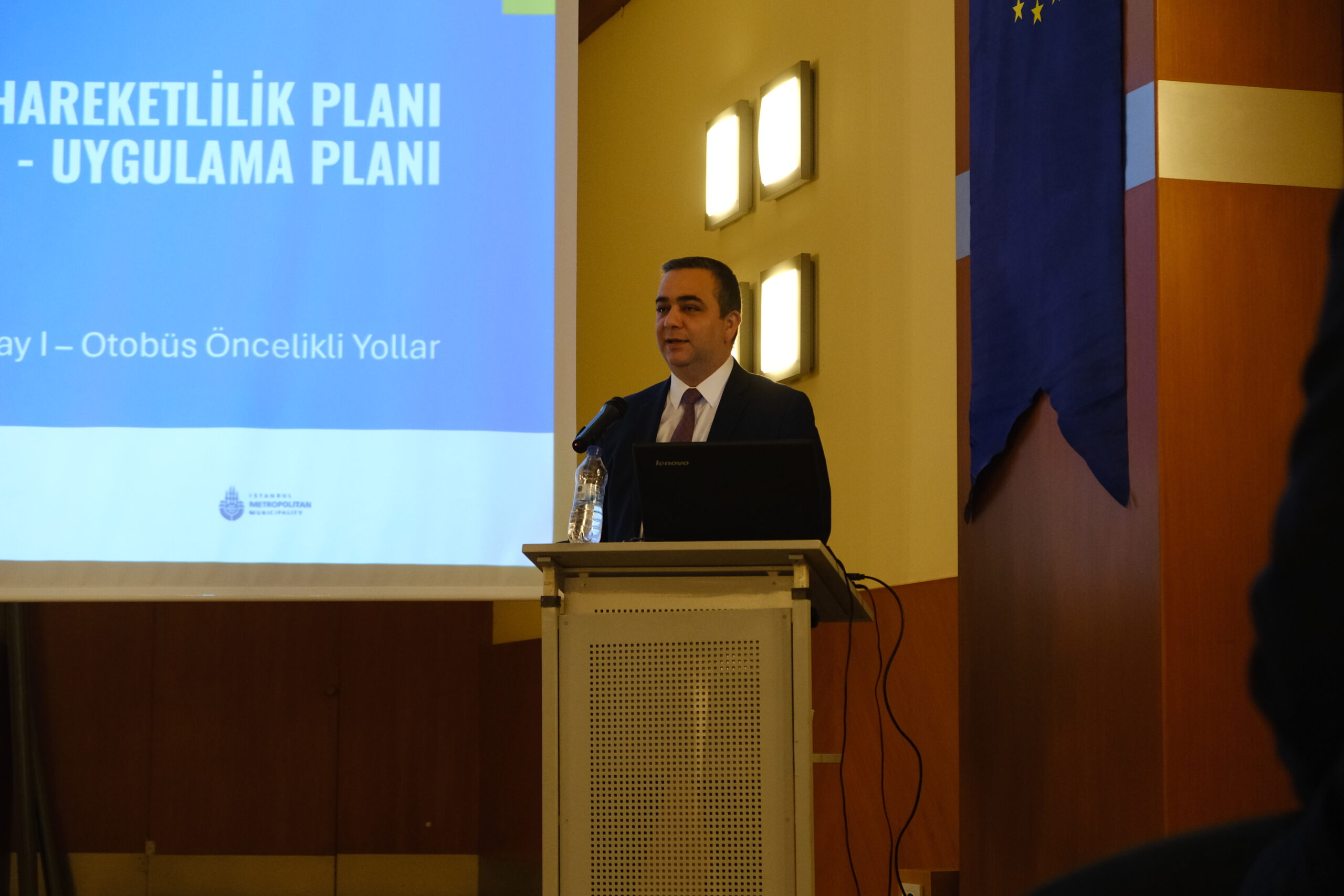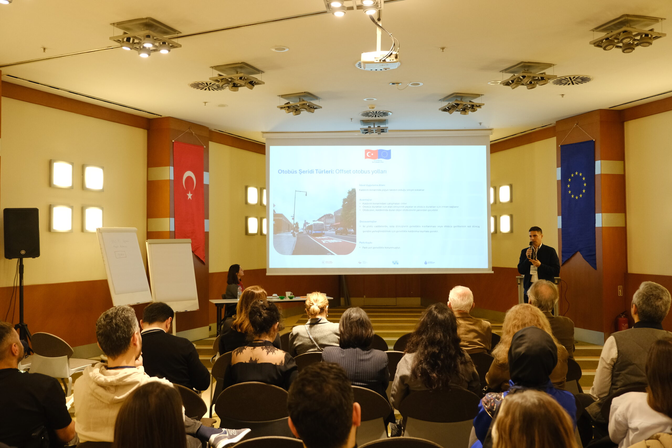 The workshop began with opening remarks by Barış Yıldırım, Head of the IMM Department of Transportation. This was followed by a presentation from Haluk Camcıgil, Project Expert, who addressed the impacts of bus priority lanes on travel time and safety. His presentation offered a detailed overview of both the benefits and potential challenges of implementing such lanes.